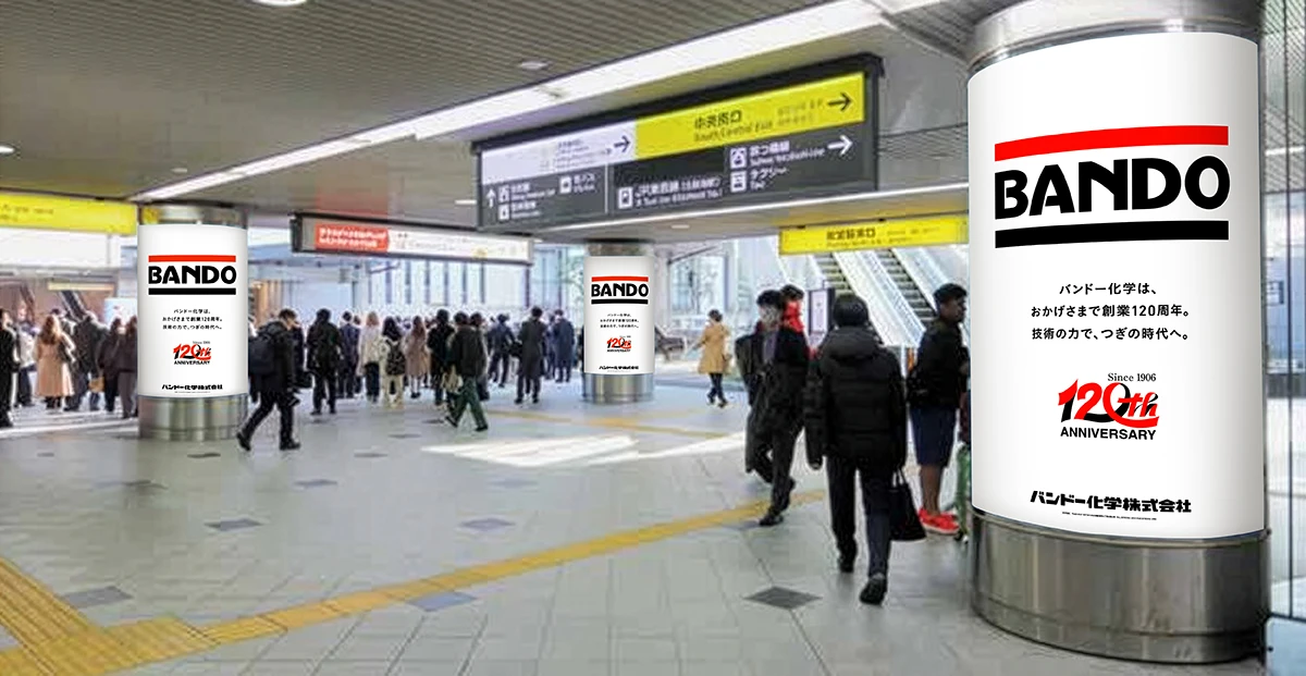大阪、新大阪、バンドー化学の地元・神戸三宮、さらには東京。日本屈指の利用者数を誇る4つの駅の構内に、バンドー化学の120周年記念広告が登場します。