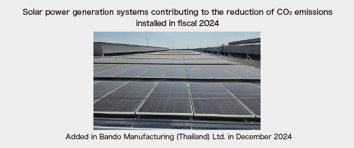 We are promoting the introduction and utilization of renewable energy, and since fiscal 2010, we started introducing solar power generation systems gradually. In fiscal 2024, Bando Manufacturing (Thailand) Ltd. installed an additional solar power generation system with a capacity of 1,198kW. This is equivalent to about 11.7% of the total electricity used in the base, and CO2 emissions will be reduced by approximately 828t-CO2 per year. Combined with the 998kW solar power generation system introduced at the plant in fiscal 2021, solar power now accounts for approximately 21.3% of the total electricity used, which is expected to reduce CO2 emissions by about 1,546t-CO2 per year (approximately 10.5% reduction for the entire base). We will continue to actively consider introduction of solar power generation systems.